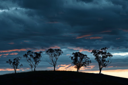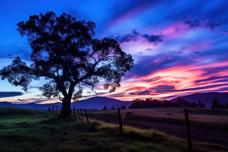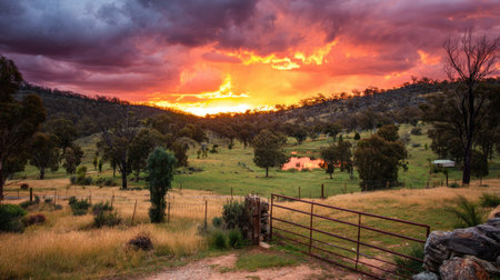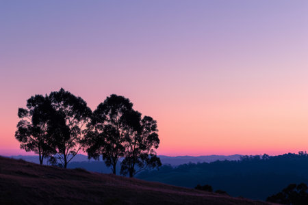 Sunset over a field with eucalyptus trees in Australia