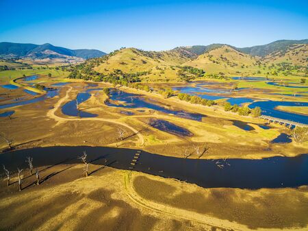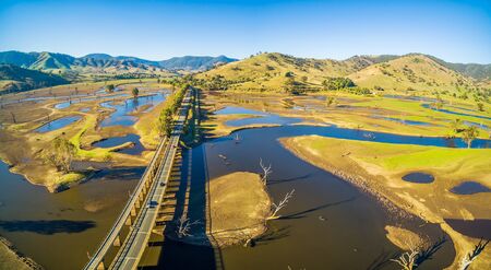 Aerial panorama landscape of Murray Valley Highway and bridge over Lake Hume, Victoria, Australia