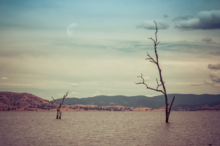 Barren trees growing out of lake water. Apocalyptic alien landscape