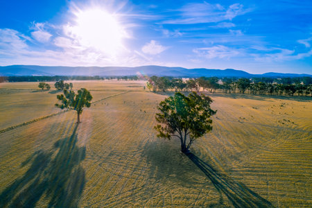Sun shining above grazelands and trees with long beautiful shadows - aerial view