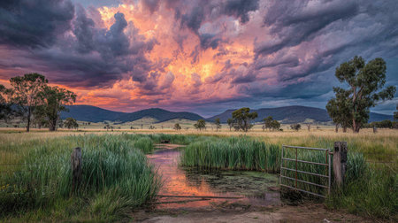 Dramatic sunset over a small stream in the Australian outback