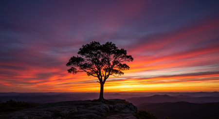 A solitary tree standing at the edge of a cliff during sunset, with vibrant colors filling the sky, symbolizing strength and resilience.