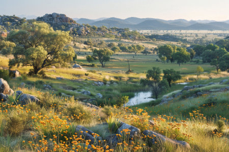 A breathtaking view of a tranquil landscape at dawn, featuring rolling hills, golden grass, and a soft pastel sky. This serene scene captures the essence of nature's beauty.