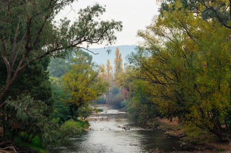 Smoke haze from burnoffs hangs over the Ovens River in Bright in north eastern Victoria, Australia.