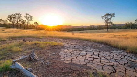 A stunning sunset casts warm light over a parched landscape with cracked earth and sparse vegetation. This serene scene captures the beauty of nature and the effects of drought in a rural setting.