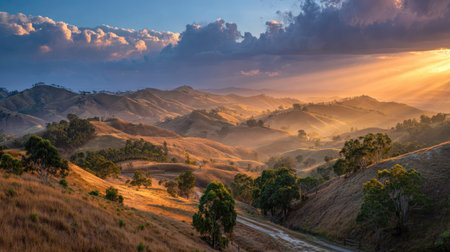 A breathtaking sunrise illuminates rolling hills, casting a warm golden glow over the landscape. The scene evokes tranquility and the beauty of nature.