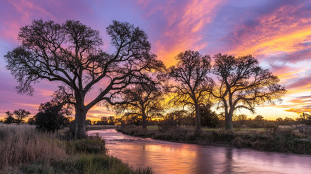 A stunning sunset view featuring a peaceful river surrounded by majestic trees, reflecting vibrant colors in the sky. A perfect natural landscape.
