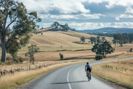 Professional cyclist training on a scenic Australian country road surrounded by dry fields and eucalyptus trees