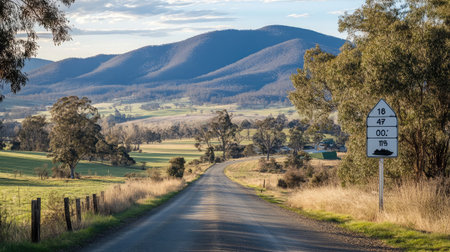Open empty road surrounded by farms and fields in Australia. Road trip travel concept
