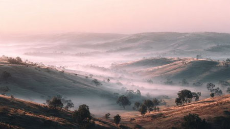 Experience the serene beauty of a tranquil dawn in this breathtaking landscape, showcasing rolling hills and a soft pink sky illuminating glistening fields.