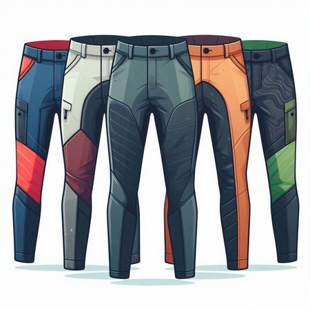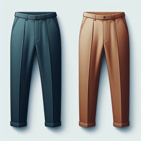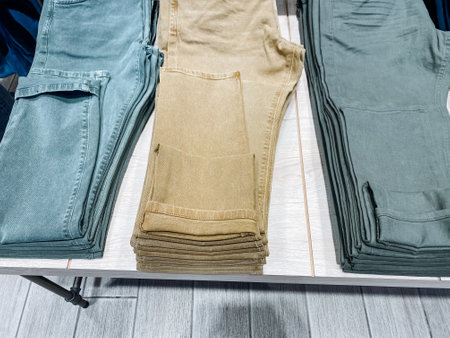 Three vibrant pairs of stylish pants are arranged on a polished table, creating an eyecatching display that attracts shoppers and curious onlookers, inviting them to explore further