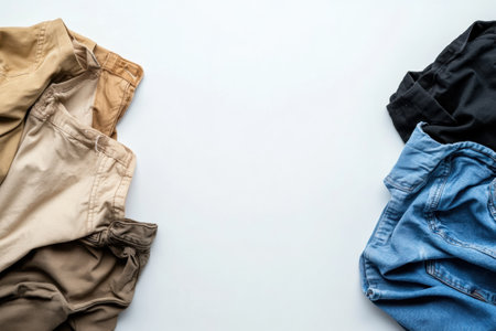 Overhead view of arranged jeans and trousers in various shades on a wooden floor