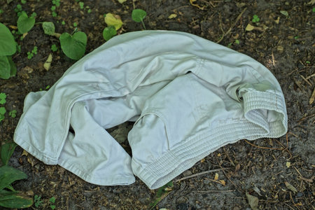 Three pieces of old-fashioned, soiled garments hang against a rustic, natural backdrop