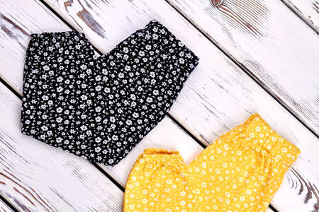Infant girl collection of colored trousers. Baby-girl set of new folded leggings on white wooden background. Kids summer casual apparel.