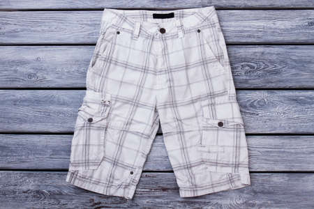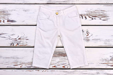 Little girls solid capri isolated. Childrens white cotton trousers isolated on vintage wooden background. Kids fashion apparel on sale.