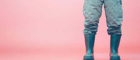A person stands wearing green work boots and light cargo pants with a vibrant pink background highlighting their outfit and footwear.