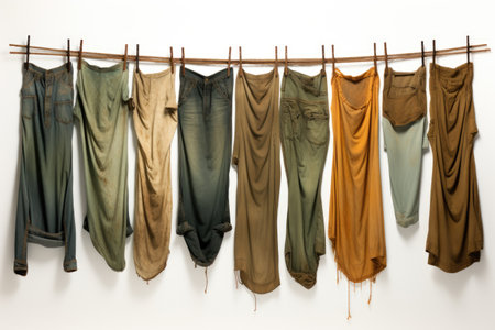Clothes Hanging on Clothes Line. A row of various clothes suspended on a clothesline outdoors. The garments appear to be drying in the sun, swaying gently in the breeze.