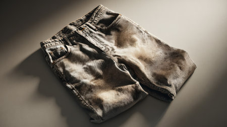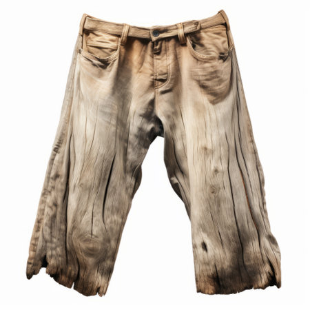 a pair of reclaimed wood jeans, crafted in a light bronze and beige style, captured in this associated press photo. the flowing brushwork adds an ominous touch to these unique jeans made of rubber. perfect for those embracing the cabincore trend, these jeans stand out against a white background. ai generated