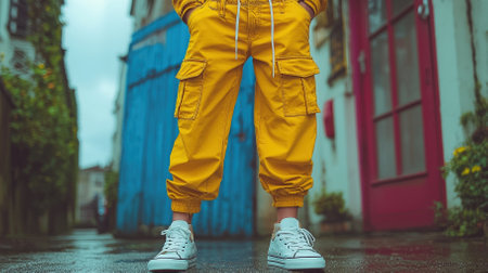 A stylish individual stands confidently in vibrant yellow cargo pants and white sneakers in a rainy urban alley, showcasing modern street fashion.