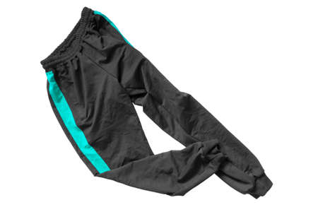 Gray sports women's trousers lie on a white background and an empty space for text, fashion