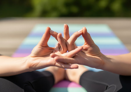 Close up of woman hands in uttarabodhi mudra, a yoga hand gesture for enlightenment and overcoming fear. hands positioned on colorful yoga mat outdoors in sunlight.