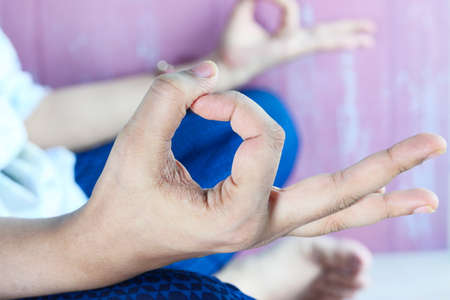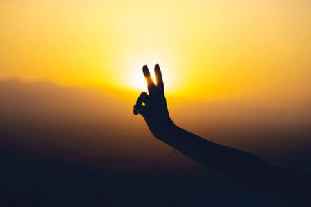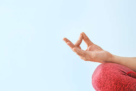 Hand symbol of Yoga or Nirvana expression. Mantra yoga meditation, spiritual mental health practice with hand gesture.