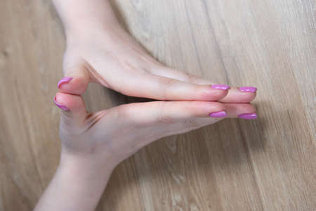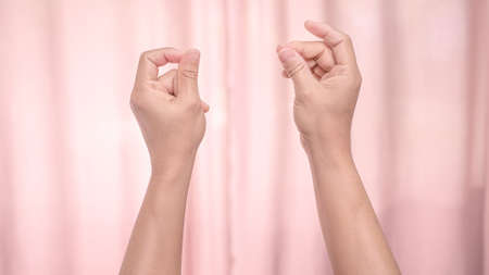 Hands snapping fingers isolated on pink background. Isolated female hands flicking fingers to the rhythm of the music. Sign language.