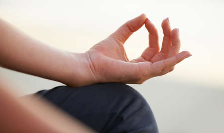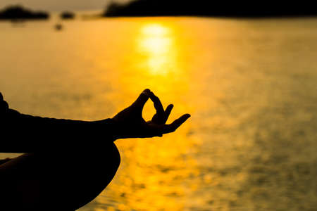 Close up of mudra in lotus position on the beach with selective focus on sunset light.