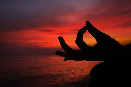 Silhouette, hand of Woman Meditating in Yoga pose or Lotus Position by the Sea at Sunset. Rear View. Nature Meditation Concept. Low key photo. relax time.