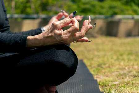 close-up of the hands of a mature woman practicing yoga and sitting in the lotus position. Concept concentration, healthy life.