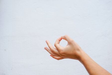 Hand doing a meditation pose or yoga hand with two fingers isolated on a white wall texture. Close up view.