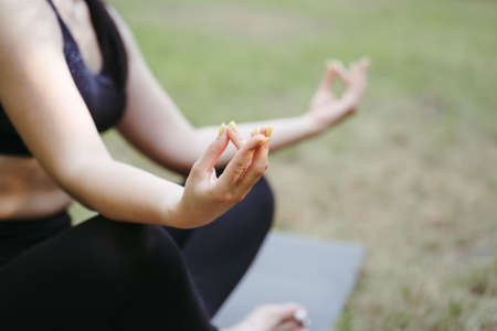 Close up hands. Woman do yoga outdoor. Woman exercising vital and meditation for fitness lifestyle club at the nature background. Healthy Concept