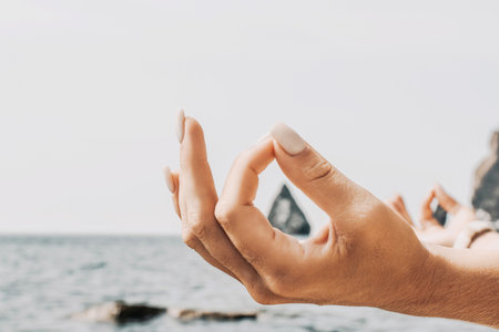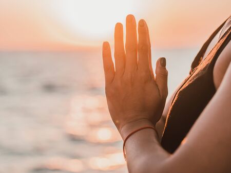 Female hand in aakaash mudra yogic gesture, peaceful calm woman practices meditation near the sea outdoors, closeup
