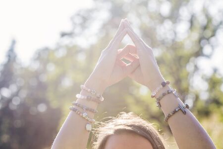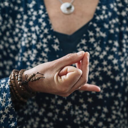 Closeup of woman hand in yoga symbolic gesture mudra wearing bracelets