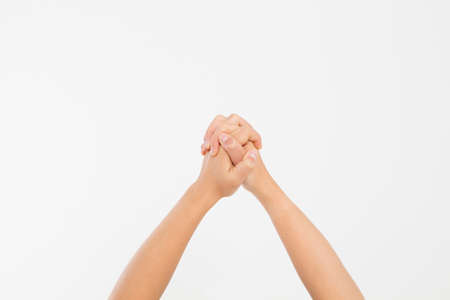 Human hands doing Akash Yoga Mudra isolated on a white-colored seamless background. Shot of pair of hands demonstrating Akash Mudra.