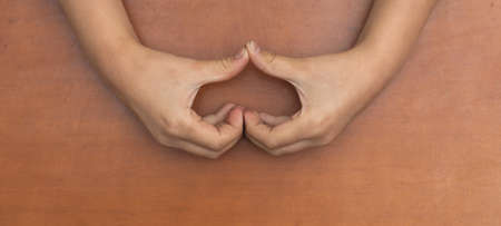Hridaya Mudra or Spiritual Heart Mudra. Hand gesture holding fingers in Hridaya Mudra for self-healing, balancing and opening of heart chakra.