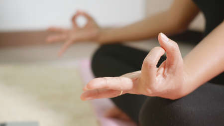 Female hand making Mudra gesture, woman practicing yoga at home, sitting in meditation pose, wearing wrist bracelets, concentration exercise, focus on right hand, indoor close up image