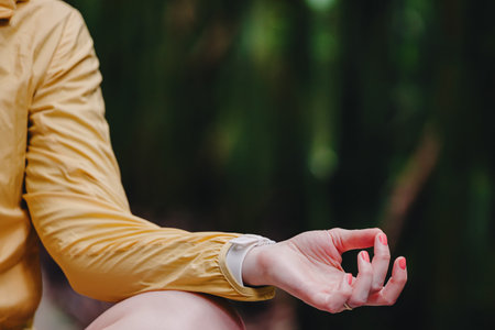 Close-up of the hand of woman relaxing in lotus pose in the park. Blurred green trees on the background