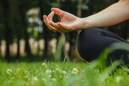 blurred close - up of woman legs sitting in lotus position and meditating and fingers in Gyan mudra on summer day