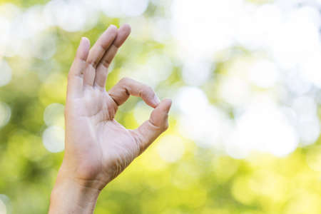 Man hand sign on green and yellow bokeh from tree background.