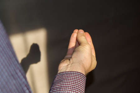 mans hand with fingers folded in a pinch, a shadow on the wall by hand