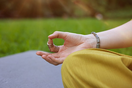 closeup of woman hand with rings and bracelets practice yoga outdoor shot