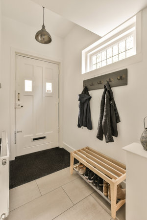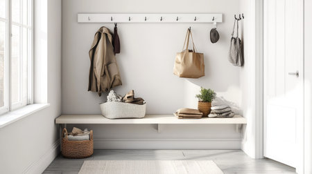 Hallway with coat hooks, doormat and white walls in bright apartment