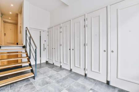 Wooden steps with metal railing located near many white doors in contemporary hall with tiled floor