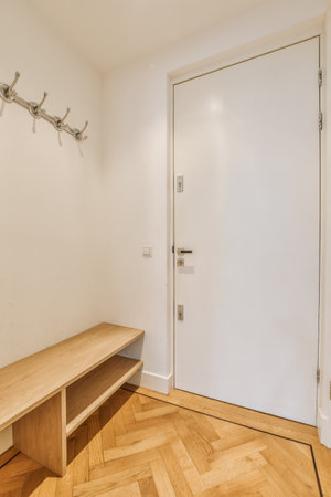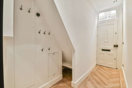 Light hallway with entrance door in apartment with minimalist wooden staircase leading upstairs in daylight