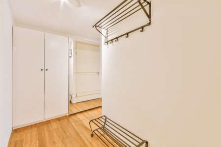 Interior of hallway with cloths rack and blooming branches in vase on commode