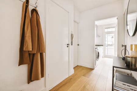 A corridor leading inside a residential apartment with hooks for clothes at the entrance