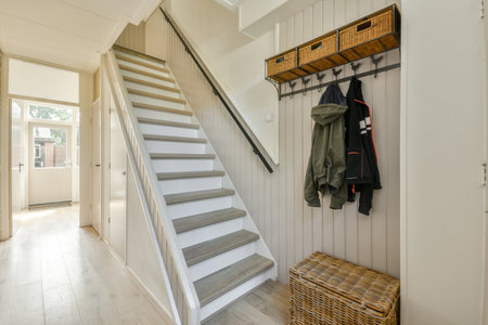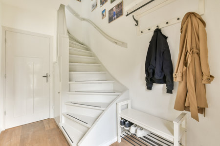 A clean and modern interior featuring a white staircase with natural light illuminating the space. Coats and shoes are neatly arranged, adding to the organized look.