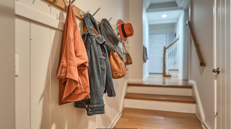 A modern hallway showcasing stylish coats on hangers, decorative wall elements, and cozy seating, creating an inviting entrance atmosphere.
