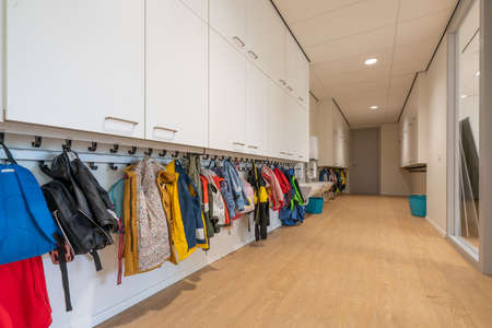ARNHEM / NETHERLANDS - AUGUST 28 2020: Cloakroom with coats and backpacks in a school building for toddlers and young children
